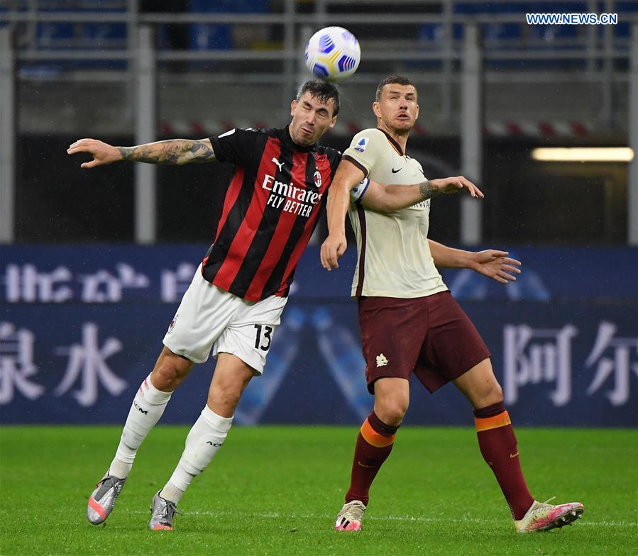 Roma's Edin Dzeko (2nd R) scores his goal during a Serie A soccer match between AC Milan and Roma in Milan, Italy, Oct. 26, 2020. (Photo by Alberto Lingria/Xinhua)