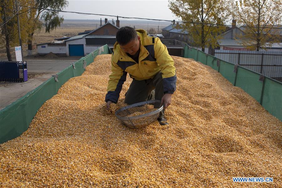 A worker examines corns in Ning'an City, northeast China's Heilongjiang Province, Oct. 27, 2020. Autumn harvest in Ning'an has mostly finished, while food processing enterprises hum. (Xinhua/Zhang Tao)