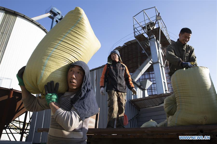 Workers unload rice at a rice processing factory in Ning'an City, northeast China's Heilongjiang Province, Oct. 27, 2020. Autumn harvest in Ning'an has mostly finished, while food processing enterprises hum. (Xinhua/Zhang Tao)
