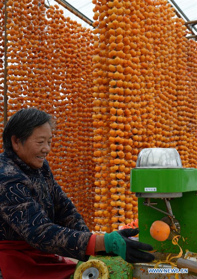 A farmer processes fresh persimmons to make them into dried snacks in Maquangou Village of Pinglu County, north China's Shanxi Province, Oct. 27, 2020. (Xinhua/Ma Yimin)