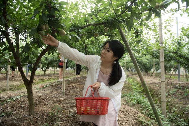 A tourist picks fruits in an orchard in Shengzhou, east China’s Zhejiang province. (Photo/Xinhua)