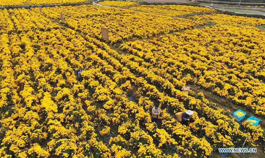 Aerial photo shows villagers plucking chrysanthemum flowers in Jinxi Village of Xima Township, Longli County of southwest China's Guizhou Province, Oct. 27, 2020. Thanks to the chrysanthemum industry, 166 poverty-stricken households in Jinxi Village were lifted out of poverty in 2019. (Xinhua/Yang Wenbin)