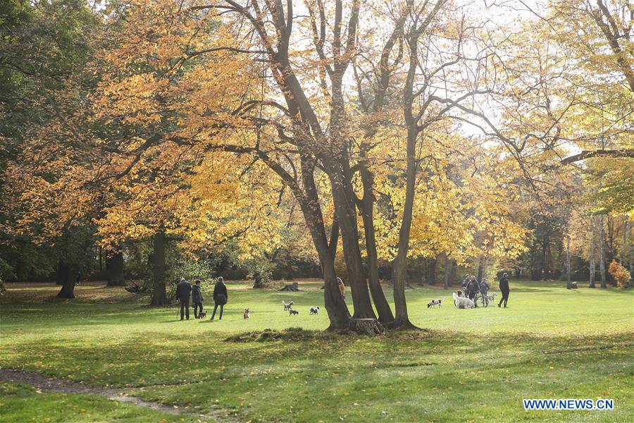 Pedestrians spend time with their pet dogs at a park in Berlin, capital of Germany, Oct. 28, 2020. (Xinhua/Shan Yuqi)