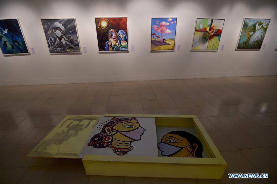 Photo taken on Oct. 28, 2020 shows artworks on display during a COVID-19 awareness exhibition in Dhaka, Bangladesh. A month-long art exhibition is underway in the Bangladeshi capital to raise public awareness of the COVID-19 pandemic. (Photo by Salim/Xinhua)