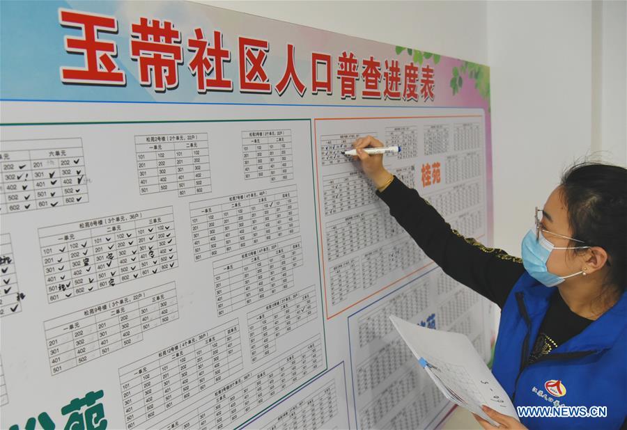 A census taker updates the latest progress information at a community of Lianyungang, east China's Jiangsu Province, Nov. 1, 2020. China on Sunday started its seventh national population count, with about 7 million census takers going door to door to document demographic changes in the world's most populous country. (Photo by Geng Yuhe/Xinhua)