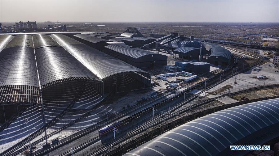 Aerial photo taken on Oct. 31, 2020 shows a freight train full of coal leaving Yulin Xiangdao International Logistics Park in Yulin City, northwest China's Shaanxi Province. Since the operation in June of 2019, Xiangdao International Logistics Park has sent 16.87 million tonnes of goods, among which 96 percent were coal. (Xinhua/Tao Ming)