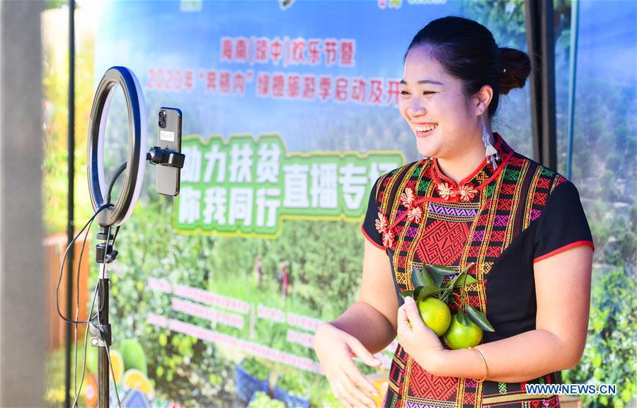 A live streamer sells green oranges online at a demonstration base in Qiongzhong, south China's Hainan Province, Nov. 1, 2020. With a planting area of about 29,000 mu (about 1,933 hectares), the green orange output in Qiongzhong is expected to reach 5,000 tonnes. (Xinhua/Yang Guanyu)
