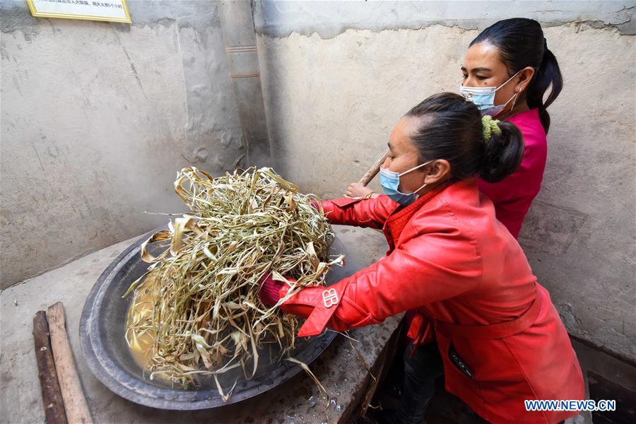 Craftswomen process mulberry bark in Moyu County of Hotan, northwest China's Xinjiang Uygur Autonomous Region, Nov. 1, 2020. Mulberry-bark paper making, a craft of over 1,300 years of history, is listed as a Chinese national intangible cultural heritage. The paper boasts a quality of being antiseptic, absorbent and tensile. (Xinhua/Ding Lei)