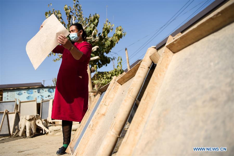 A craftswoman checks a piece of mulberry-bark paper in Moyu County of Hotan, northwest China's Xinjiang Uygur Autonomous Region, Nov. 1, 2020. Mulberry-bark paper making, a craft of over 1,300 years of history, is listed as a Chinese national intangible cultural heritage. The paper boasts a quality of being antiseptic, absorbent and tensile. (Xinhua/Ding Lei)