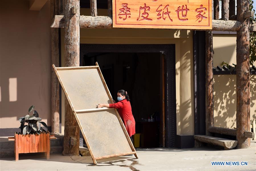 A craftswoman airs a piece of mulberry-bark paper in Moyu County of Hotan, northwest China's Xinjiang Uygur Autonomous Region, Nov. 1, 2020. Mulberry-bark paper making, a craft of over 1,300 years of history, is listed as a Chinese national intangible cultural heritage. The paper boasts a quality of being antiseptic, absorbent and tensile. (Xinhua/Ding Lei)