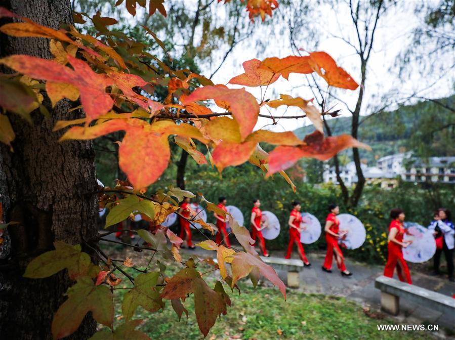 Photo taken on Nov. 1, 2020 shows the scenery of red leaves at Zhinan Village of Taihuyuan Town in Hangzhou, east China's Zhejiang Province. (Xinhua/Xu Yu)