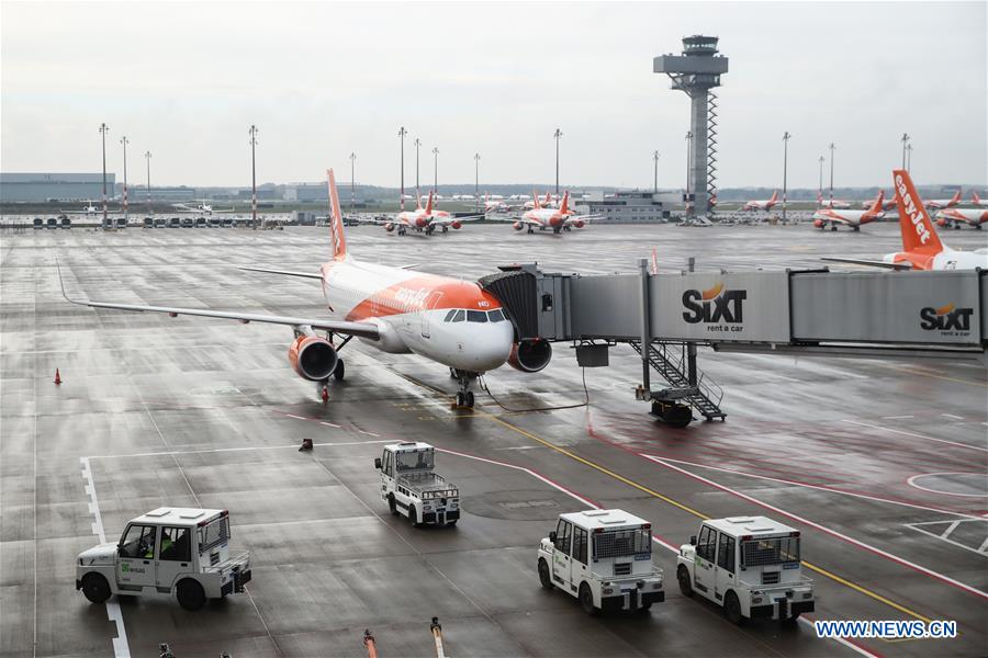 An EasyJet aircraft is seen at the newly-opened Berlin Brandenburg Airport in Schoenefeld, Germany, on Nov. 1, 2020. Following several delays, Berlin Brandenburg Airport opened to the public on Oct. 31. (Xinhua/Shan Yuqi)