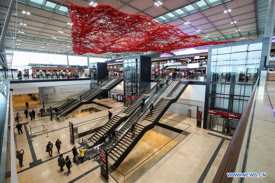 Photo taken on Nov. 1, 2020 shows an interior view of the newly-opened Berlin Brandenburg Airport in Schoenefeld, Germany. Following several delays, Berlin Brandenburg Airport opened to the public on Oct. 31. (Xinhua/Shan Yuqi)