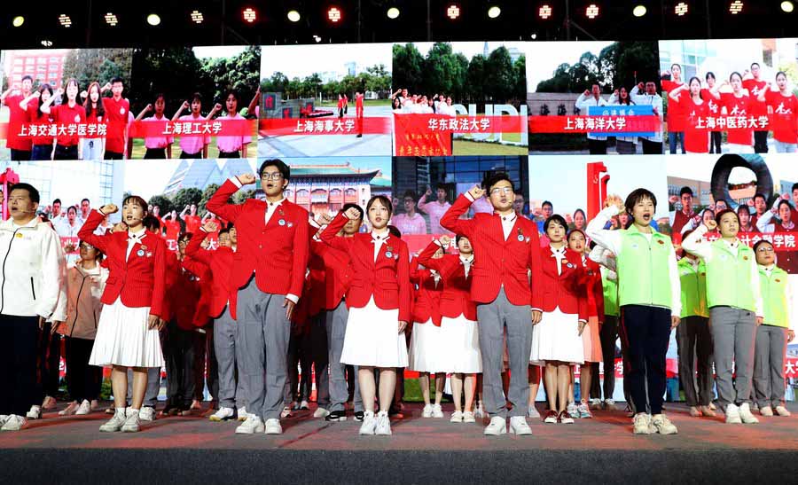 Volunteers of the third China International Import Expo (CIIE) attend an oath-taking ceremony at the National Exhibition and Convention Center in Shanghai, east China, Oct. 18, 2020. (Xinhua/Liu Ying)