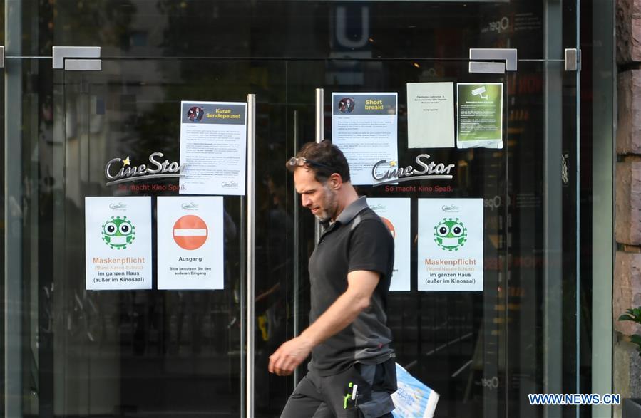 A pedestrian walks past a closed cinema in Frankfurt, Germany, on Nov. 2, 2020. New COVID-19 infections in Germany increased by 12,097 within one day to a total of 545,027 as the country entered its second partial lockdown, the federal government agency for disease control and prevention Robert Koch Institute (RKI) announced on Monday. (Xinhua/Lu Yang)