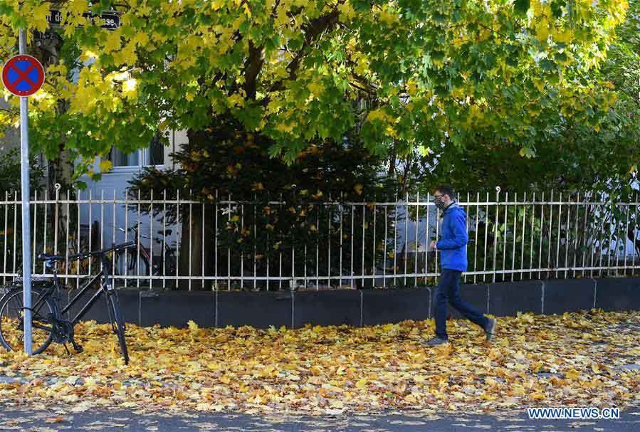 A pedestrian wearing a face mask walks on a street in Frankfurt, Germany, on Nov. 2, 2020. New COVID-19 infections in Germany increased by 12,097 within one day to a total of 545,027 as the country entered its second partial lockdown, the federal government agency for disease control and prevention Robert Koch Institute (RKI) announced on Monday. (Xinhua/Lu Yang)