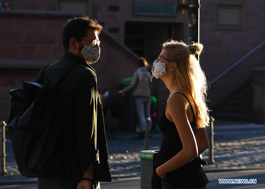 Two pedestrians wearing face masks talk to each other on a square in Frankfurt, Germany, on Nov. 2, 2020. New COVID-19 infections in Germany increased by 12,097 within one day to a total of 545,027 as the country entered its second partial lockdown, the federal government agency for disease control and prevention Robert Koch Institute (RKI) announced on Monday. (Xinhua/Lu Yang)
