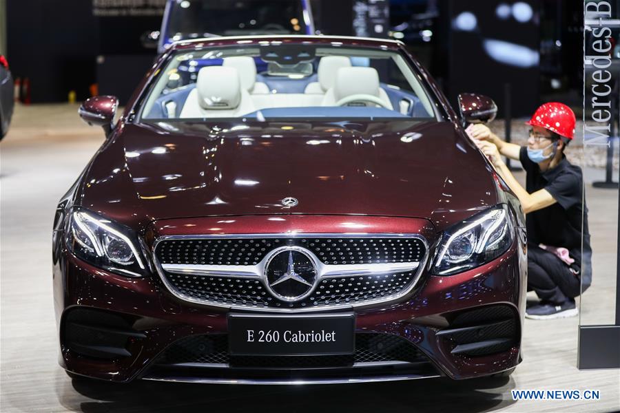 A staff member cleans a vehicle at the automobile exhibition area of the 3rd China International Import Expo (CIIE) in east China's Shanghai, Nov. 2, 2020. The third CIIE will be held from Nov. 5 to 10 in Shanghai. (Xinhua/Ding Ting)