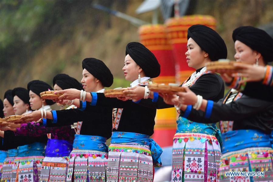People of the Yao ethnic group perform during the folk Panwang Festival as well as a harvest festival in Rongshui Miao Autonomous County, south China's Guangxi Zhuang Autonomous Region, Nov. 1, 2020. (Xinhua/Huang Xiaobang)