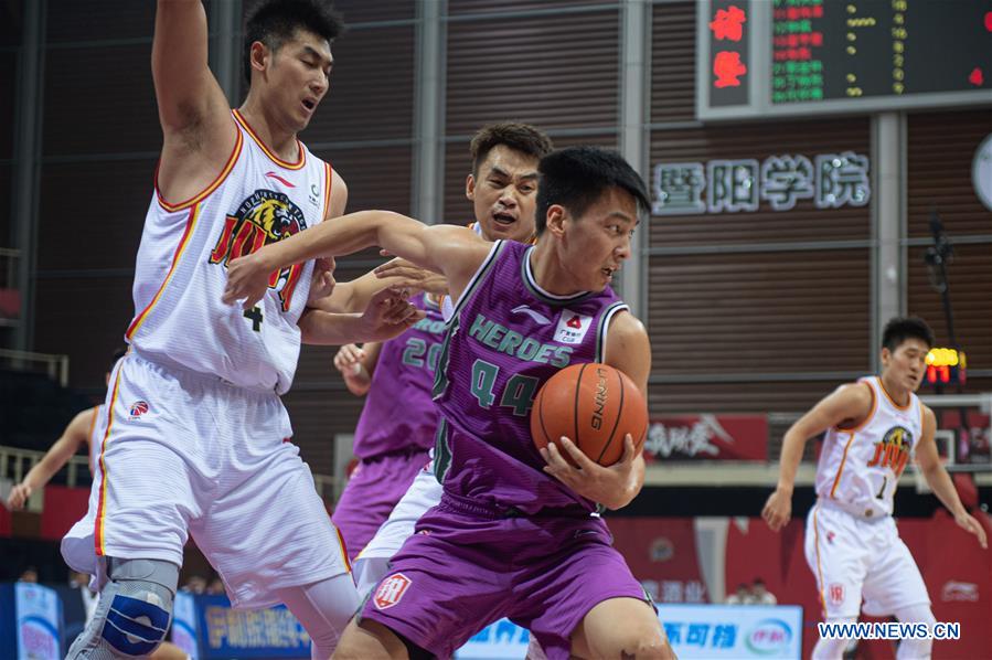 Chen Peidong (front R) of Shandong Heroes competes during the 7th round match between Jilin Northeast Tigers and Shandong Heroes at the 2020-2021 season of the Chinese Basketball Association (CBA) league in Zhuji, east China's Zhejiang Province, Nov. 2, 2020. (Xinhua/Jiang Han)
