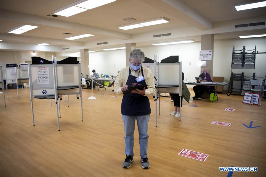 An election official works at a polling station in Washington, D.C., the United States, on Nov. 3, 2020. Voting on Election Day is underway across the United States, as the COVID-19 pandemic is raging on and political divide running deeper. (Xinhua/Liu Jie)