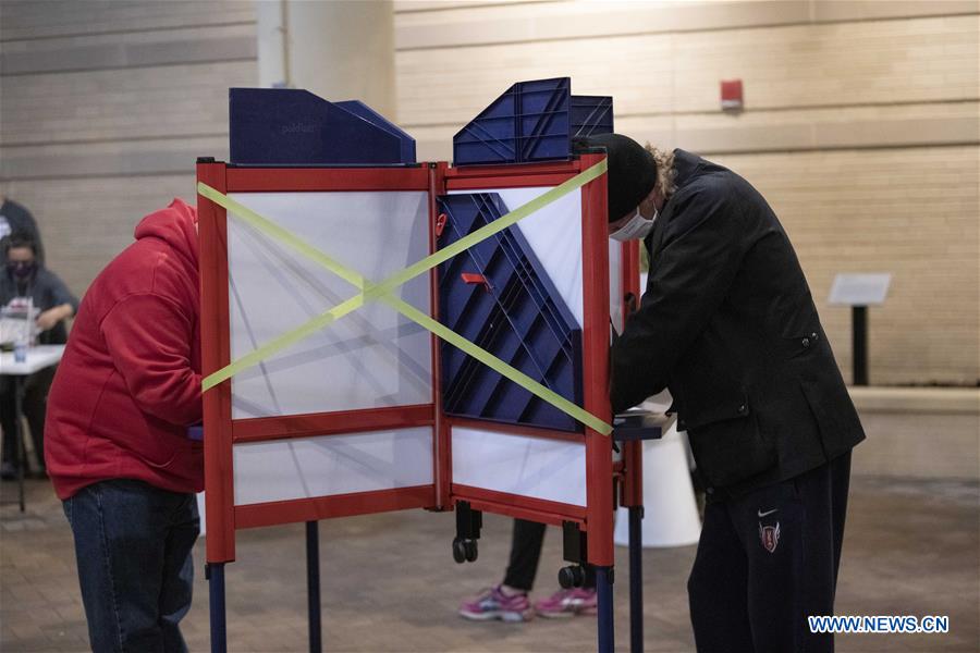 Voters fill in their ballots at a polling station in Arlington, Virginia, the United States, Nov. 3, 2020. Voters in major cities along the east coast of the United States started to cast their ballots early Tuesday, as polls continue to open across the country to decide the presidency. (Xinhua/Liu Jie)