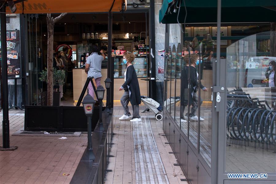 A woman wearing a mask walks by a cafe which is only has take-away services in Athens, Greece, on Nov. 3, 2020. Amidst the surge of cases, Greek Prime Minister Kyriakos Mitsotakis earlier on Oct. 31 announced a new set of restrictions that will start on Nov. 3 and will last until December in an effort to avoid a full nationwide lockdown like the one imposed in spring. In regions of high alert with heavy epidemiological load, which include Attica, restaurants and cafeterias are closing with the exception of take away and delivery services. (Xinhua/Marios Lolos)
