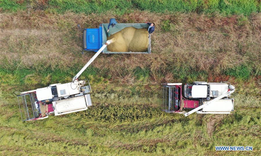 Aerial photo taken on Nov. 3, 2020 shows farmers loading harvested paddy rice in Jiangxiang Town, Nanchang of east China's Jiangxi Province. (Xinhua/Peng Zhaozhi)