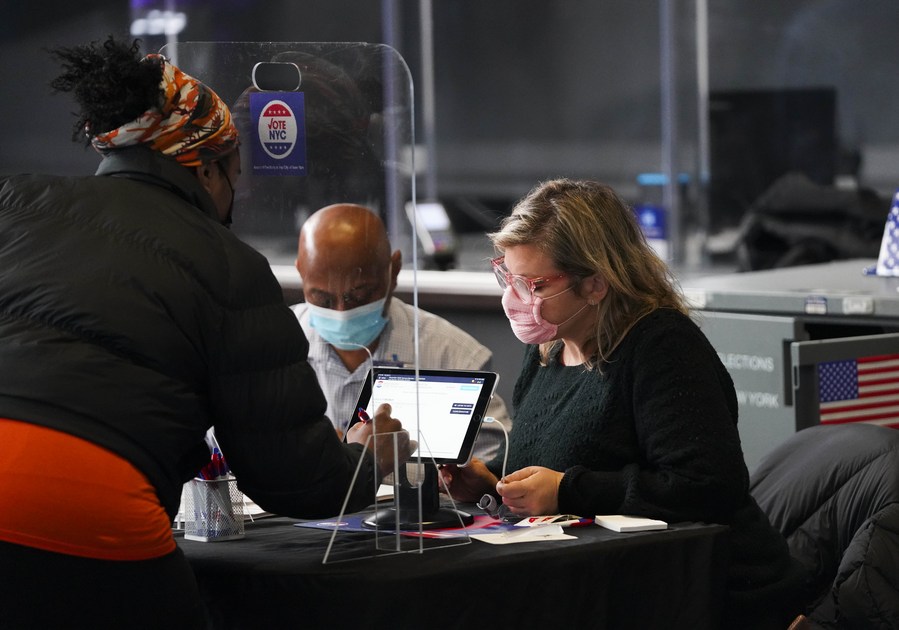 A voter checks in at a polling station in New York, the United States, Nov. 3, 2020. Voters in major cities along the east coast of the United States started to cast their ballots early Tuesday, as polls continue to open across the country to decide the presidency. (Xinhua/Wang Ying)