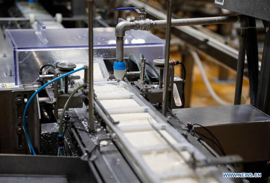 Photo taken on Nov. 3, 2020 shows boxed tofu products on the assembly line at a tofu plant of Pulmuone in Eumseong-gun of Chungcheongbuk-do, South Korea. Pulmuone, a leading food company in South Korea, will be an exhibitor at the third China International Import Expo (CIIE), which will take place from Nov. 5 to 10 in Shanghai. (Xinhua/Wang Jingqiang)