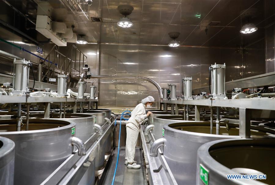 A staff member checks on raw beans at a tofu plant of Pulmuone in Eumseong-gun of Chungcheongbuk-do, South Korea, Nov. 3, 2020. Pulmuone, a leading food company in South Korea, will be an exhibitor at the third China International Import Expo (CIIE), which will take place from Nov. 5 to 10 in Shanghai. (Xinhua/Wang Jingqiang)