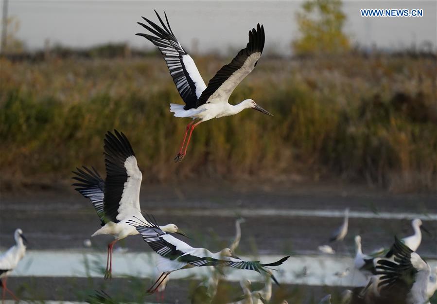 A flock of oriental white storks forage during their southward migration at Caofeidian wetland in Tangshan, north China's Hebei Province, Nov. 3, 2020. (Xinhua/Yang Shiyao)