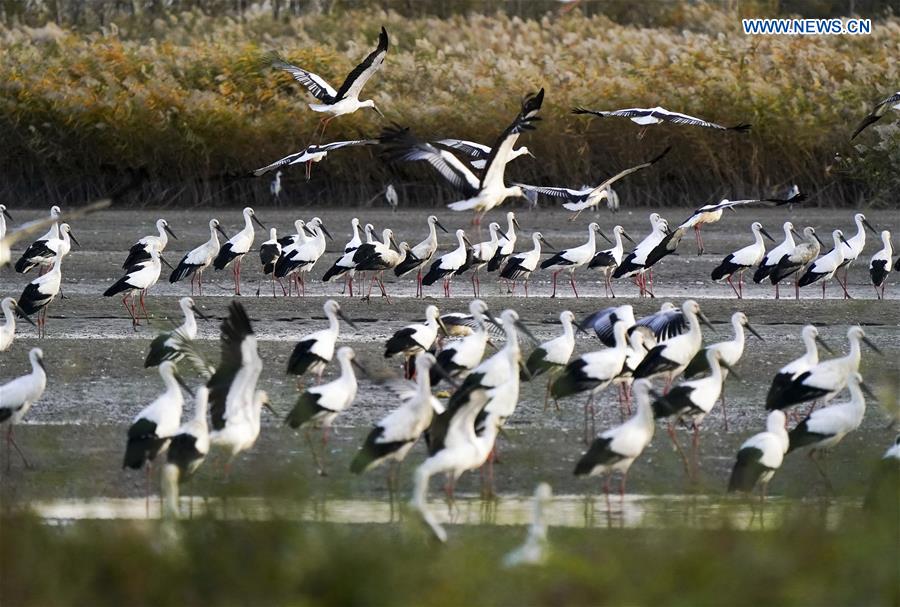 A flock of oriental white storks forage during their southward migration at Caofeidian wetland in Tangshan, north China's Hebei Province, Nov. 3, 2020. (Xinhua/Yang Shiyao)