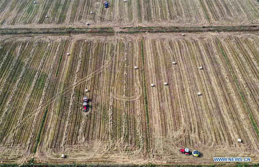 Aerial photo taken on Nov. 3, 2020 shows agricultural vehicles collecting rice straw in the field at Jiangxiang Town of Nanchang County, Nanchang, east China's Jiangxi Province. The recycling of rice straw is commonly conducted with the ongoing rice harvest. (Xinhua/Peng Zhaozhi)