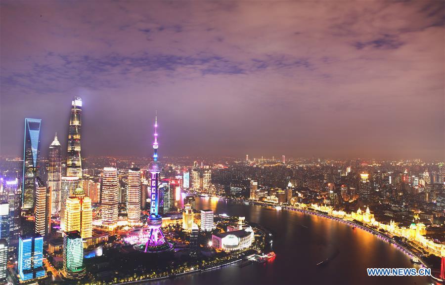 The multiple exposure photo taken on Oct. 26, 2020 shows the night view along the Huangpu River in east China's Shanghai. The opening ceremony of the 3rd China International Import Expo (CIIE) and the Hongqiao International Economic Forum will be held on Wednesday in Shanghai. (Xinhua/Fang Zhe)