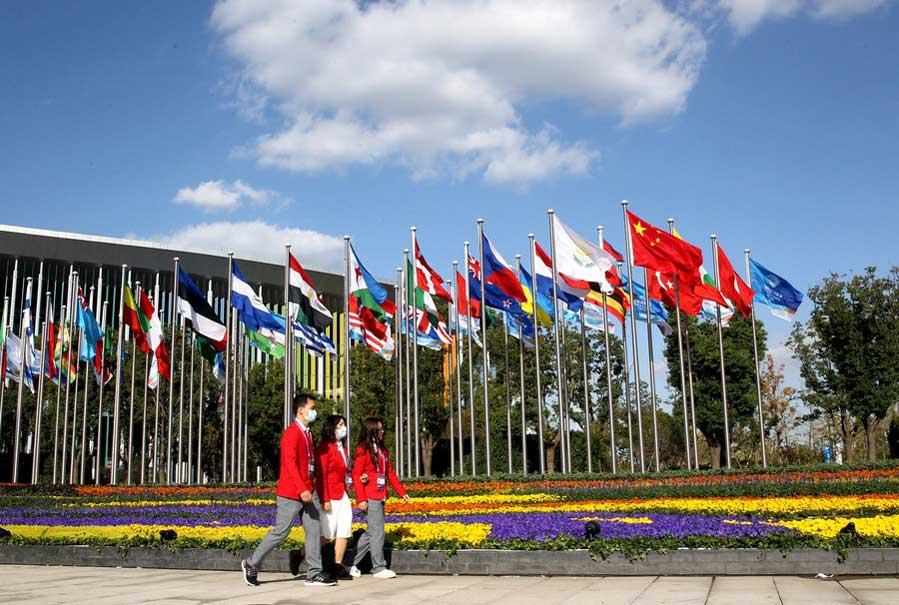 Volunteers walk past the south square of the National Exhibition and Convention Center (Shanghai), the main venue for the 3rd China International Import Expo (CIIE), in east China's Shanghai, Nov. 3, 2020. (Xinhua/Chen Fei)