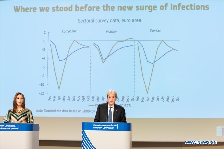 BRUSSELS, Nov. 5 (Xinhua) -- The European Union (EU) on Thursday ditched hope of a quick turnaround for European economies, predicting that pre-pandemic levels will only be reached in 2023.