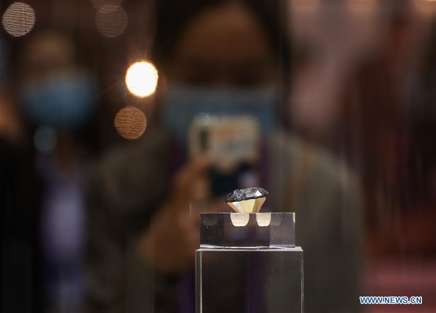 A visitor takes photos of an 88-carat black diamond with 57 facets at the consumer goods exhibition area during the third China International Import Expo (CIIE) in Shanghai, east China, Nov. 5, 2020. The diamond, which belongs to the French jewelry brand Korloff, is originated in medieval Europe according to the records. (Xinhua/Ding Ting)