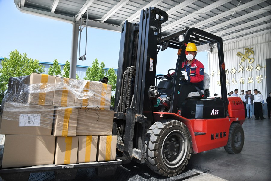 Commodities from South Korea are transported to a warehouse under full-time tracking at a cross-border e-commerce supervision center in Qingdao, east China's Shandong Province, June 3, 2020. (Xinhua/Li Ziheng)