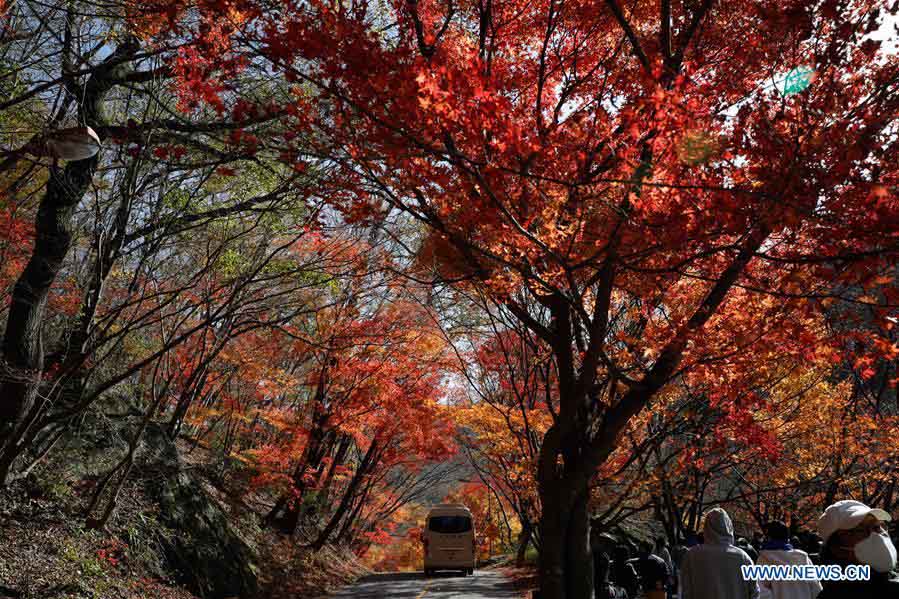 People walk under maple trees at Naejangsan National Park in Jeongeup City of North Jeolla Province, South Korea, Nov. 8, 2020. Naejangsan is a popular tourist destination in South Korea, particularly in autumn due to its spectacular maple scenery. (Xinhua/Wang Jingqiang)