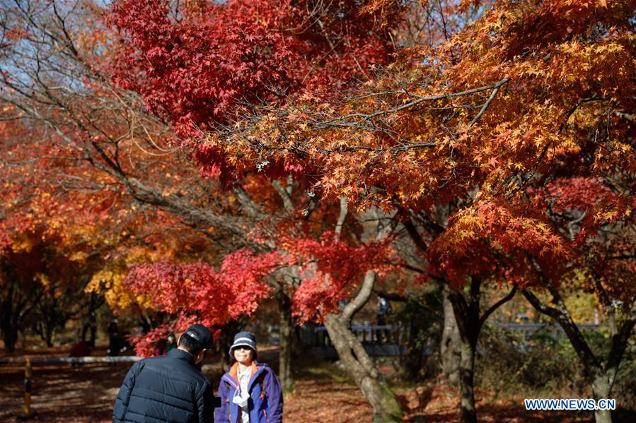 A woman poses for pictures near maple trees at Naejangsan National Park in Jeongeup City of North Jeolla Province, South Korea, Nov. 8, 2020. Naejangsan is a popular tourist destination in South Korea, particularly in autumn due to its spectacular maple scenery. (Xinhua/Wang Jingqiang)