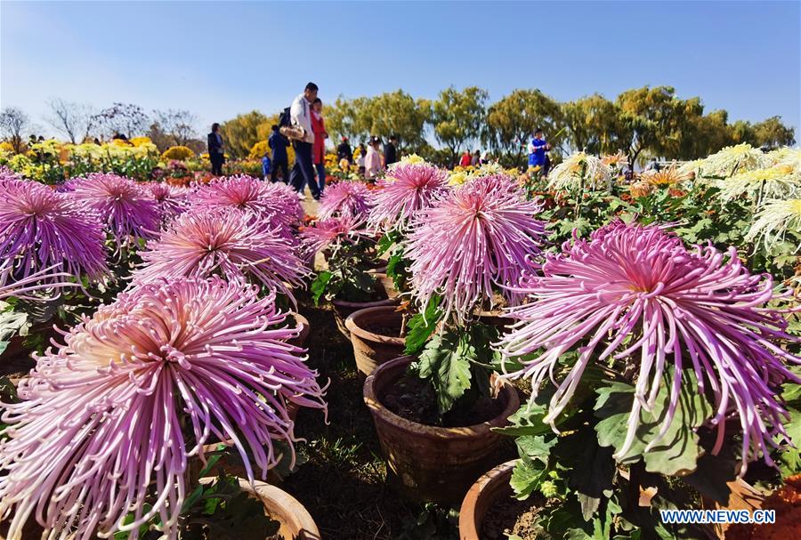 Tourists visit a chrysanthemum park at Luanxie Village in Shahe City, north China's Hebei Province, Nov. 8, 2020. The village has introduced high-quality species of chrysanthemum to boost tourism recent years. Over 30,000 pots of chrysanthemum of some 500 species were planted at the chrysanthemum park. (Xinhua/Mu Yu)