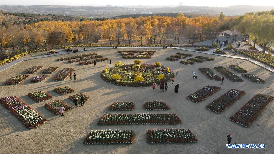 Aerial photo taken on Nov. 8, 2020 shows tourists visiting a chrysanthemum park at Luanxie Village in Shahe City, north China's Hebei Province. The village has introduced high-quality species of chrysanthemum to boost tourism recent years. Over 30,000 pots of chrysanthemum of some 500 species were planted at the chrysanthemum park. (Xinhua/Mu Yu)