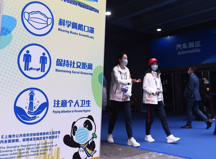 Two volunteers walk past a notice board with epidemic prevention and control measures on it during the third China International Import Expo (CIIE) in Shanghai, east China, Nov. 7, 2020. Stringent COVID-19 epidemic prevention and control measures are observed during the on-going event. (Xinhua/Zhao Dingzhe)