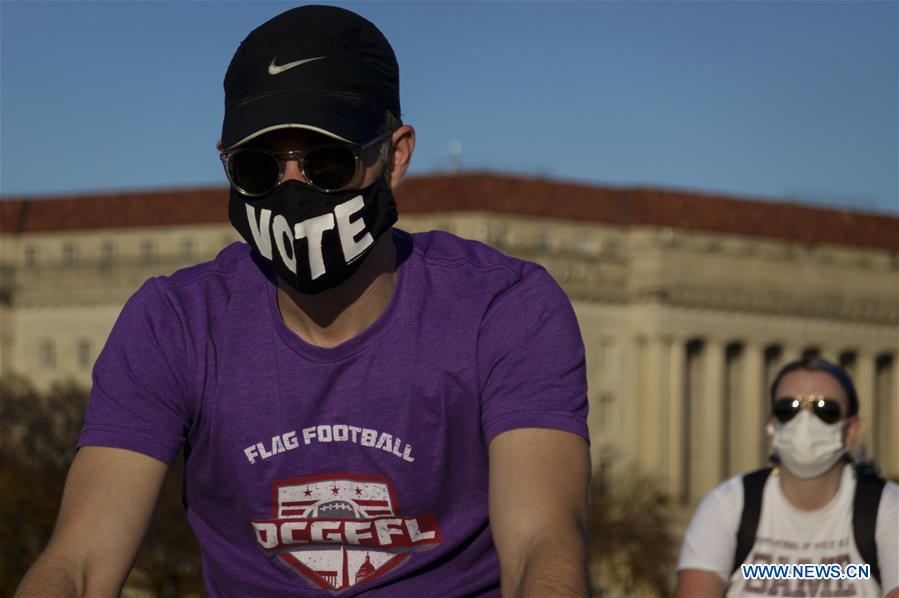 People tour the National Mall in Washington, D.C., the United States, on Nov. 8, 2020. The U.S. Centers for Disease Control and Prevention (CDC) on Sunday reported a record-high average daily increase of COVID-19 cases at nearly 100,000, a new milestone since the onset of the pandemic in the country. (Photo by Ting Shen/Xinhua)