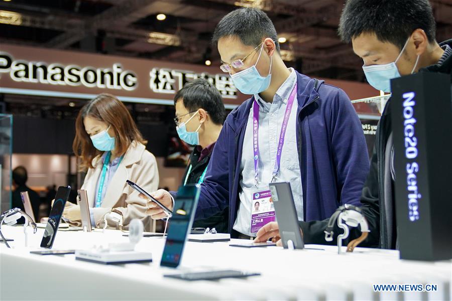 Visitors try new Samsung products at the Consumer Goods exhibition area during the third China International Import Expo (CIIE) in Shanghai, east China, Nov. 9, 2020. Companies from all corners of the globe have brought their high-quality goods and services to the ongoing CIIE. (Xinhua/Ding Ting)