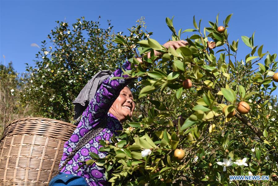 A villager picks fruits of oil-tea camellia at a oil-tea planting base in Songtao Miao Autonomous County, Tongren City, southwest China's Guizhou Province, Nov. 8, 2020. More than 180,000 mu(about 12,000 hectares) of oil-tea camellia have been planted here in Songtao to boost income of local villagers. (Photo by Long Yuanbin/Xinhua)