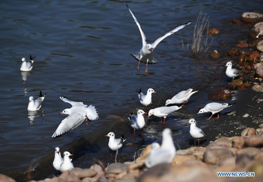 Photo taken on Nov. 11, 2020 shows black-headed gulls near the Jijiang Yangtze River Bridge in Jiangjin District of southwest China's Chongqing Municipality. Since November, flocks of black-headed gulls have arrived in Chongqing on the upper reaches of the Yangtze River. Ornithologists said the Chongqing section of China's longest river has seen the largest migratory flock of black-headed gulls in the past decade. The gulls are concentrating at a rare-fish nature reserve on the Yangtze River, a fact that is likely related to the measures including fishing bans to protect the ecology and environment there, said a researcher with the Chongqing Natural History Museum. (Xinhua/Wang Quanchao)
