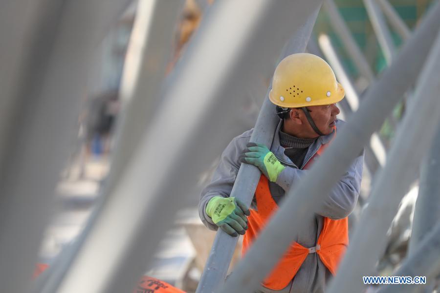 A worker of China Construction Third Engineering Bureau Co., Ltd. works at the construction site of the Guiyang Longdongbao International Airport in Guiyang, southwest China's Guizhou Province, Nov. 11, 2020. The main structure of the Terminal 3 project of Guiyang Longdongbao International Airport was announced to be completed on Wednesday. The total investment of the third-phase expansion project of Guiyang Longdongbao International Airport was about 20 billion yuan (about 3.03 billion U.S. dollars) and was scheduled to be placed in operation in 2021. (Xinhua/Ou Dongqu)