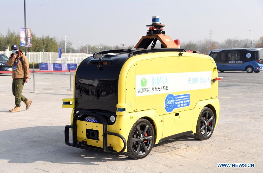 Photo taken on Nov. 12, 2020 shows an unmanned delivery car displayed at the 2020 World Intelligent Connected Vehicles Conference held in Beijing, capital of China. The three-day conference kicked off here on Wednesday. (Xinhua/Ren Chao)
